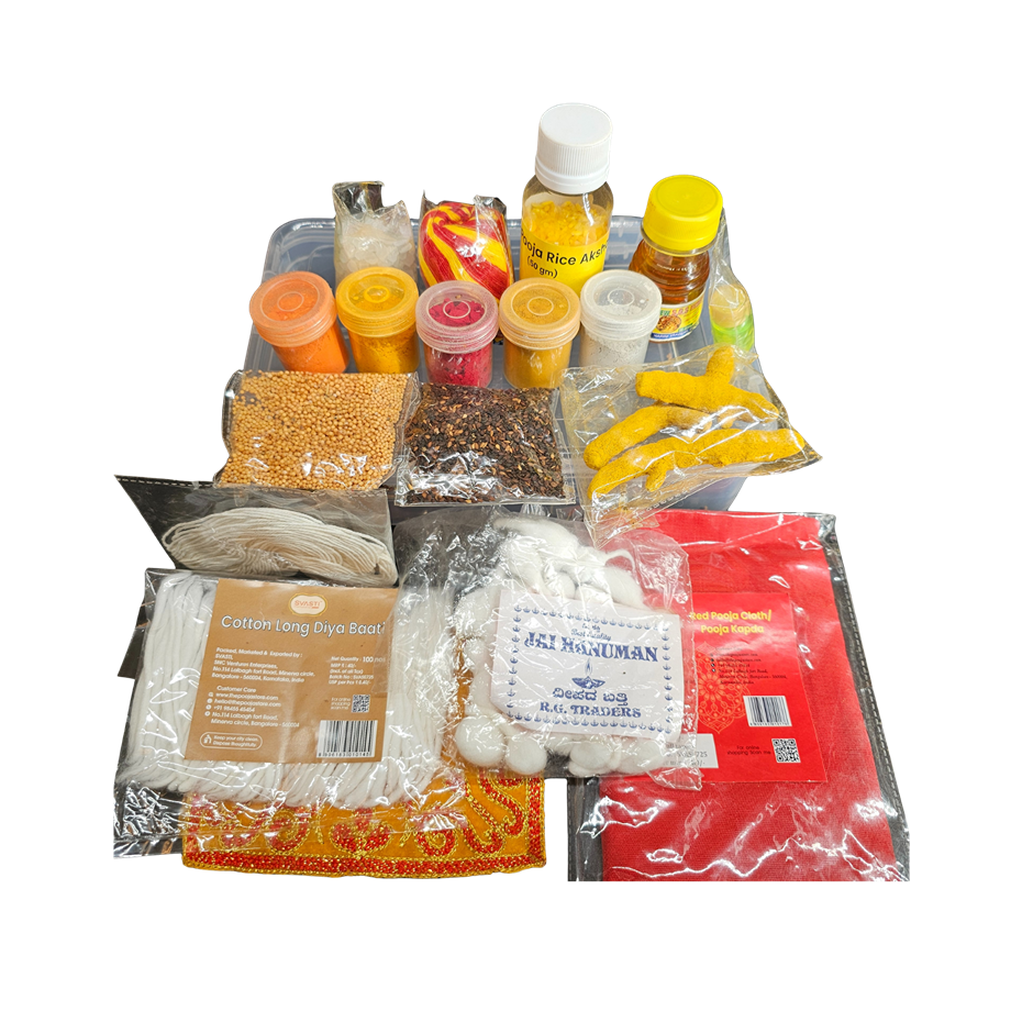 Each daily kit contains the following items: red cloth, aasana, 10g turmeric, 10g kumkum, 10g sindhoor, 10g vibhoothi, 10g ast gandha powder, 10g mishri, akshat, 15g seeds, 15g black seeds, budde bathi (½), long bathi (½), janeu 3x3 SPL, mouli (1 roll), 20g turmeric finger, itar, puja honey, and a plastic box.