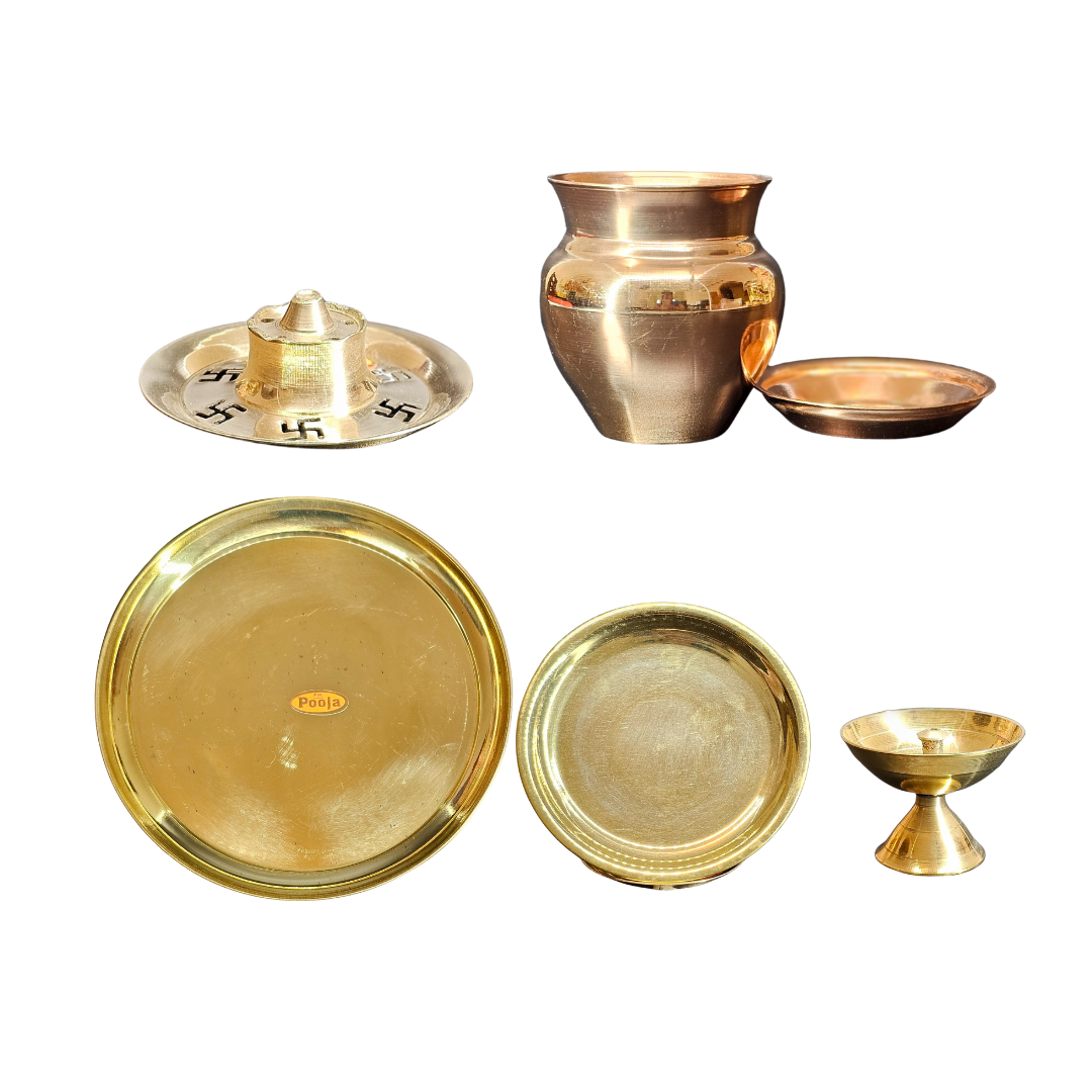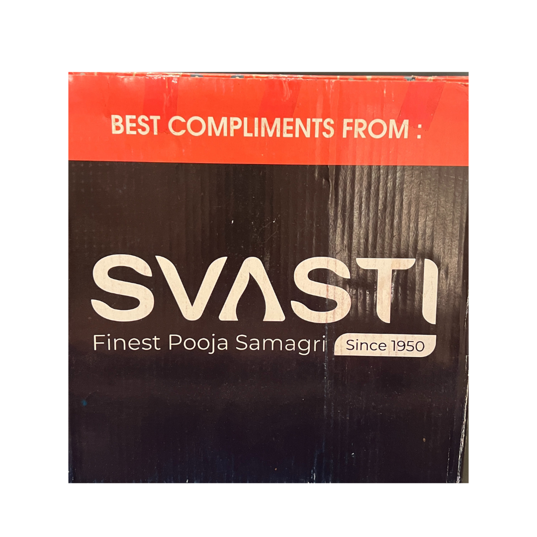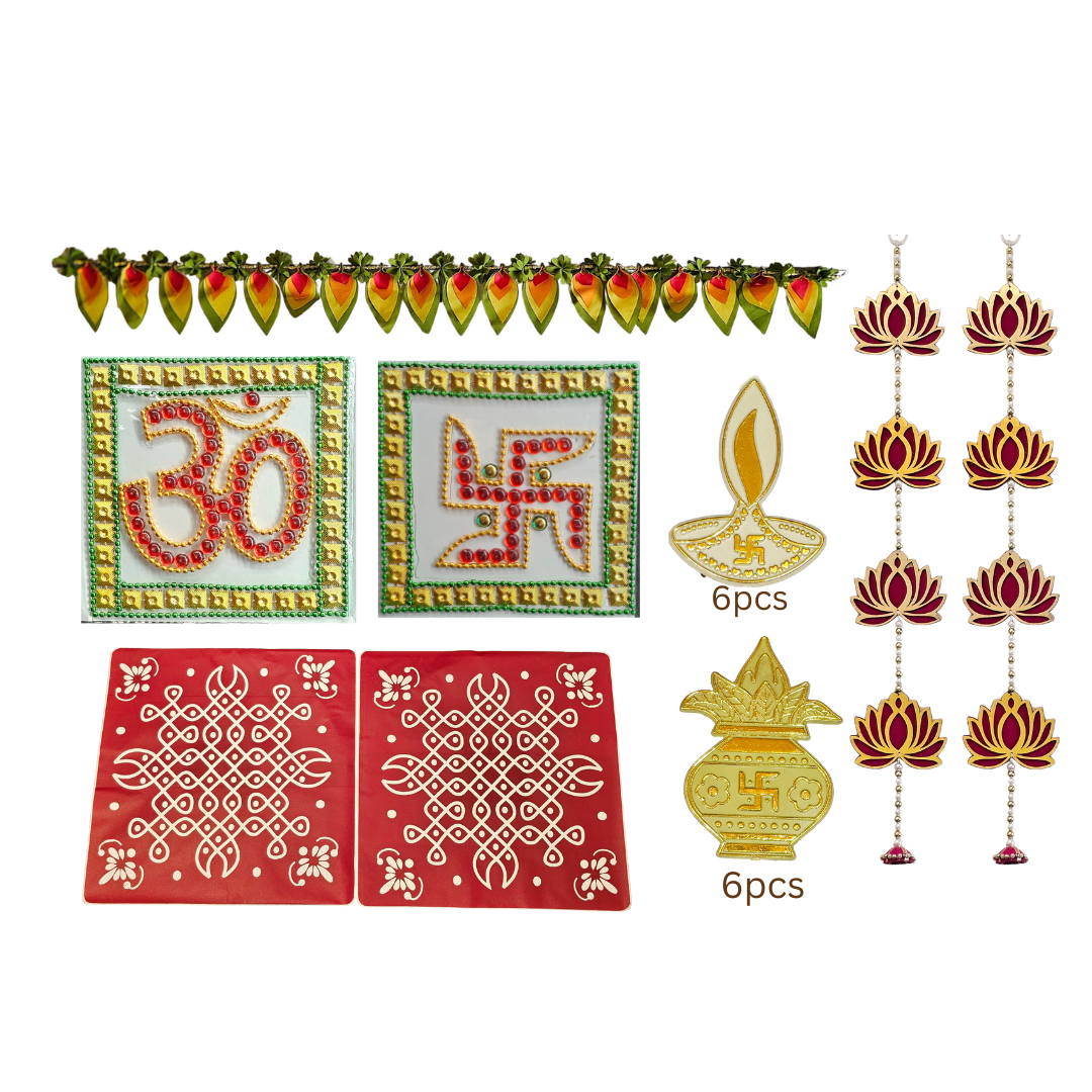 Each All-in-One Festive Box contains the following items: Brass plate 9-inch diameter, brass plate 4-inch diameter, 70g chombu with plate, piyali deep (2 pieces), agarbatti stand, swastik sign sticker (square), Om sign sticker (square), floor rangoli 10x10 (2 pieces), hanging deep sticker 6s, hanging kalash sticker 6s, Toran Green 1m & Side , Hanging 60cm, all in one box.