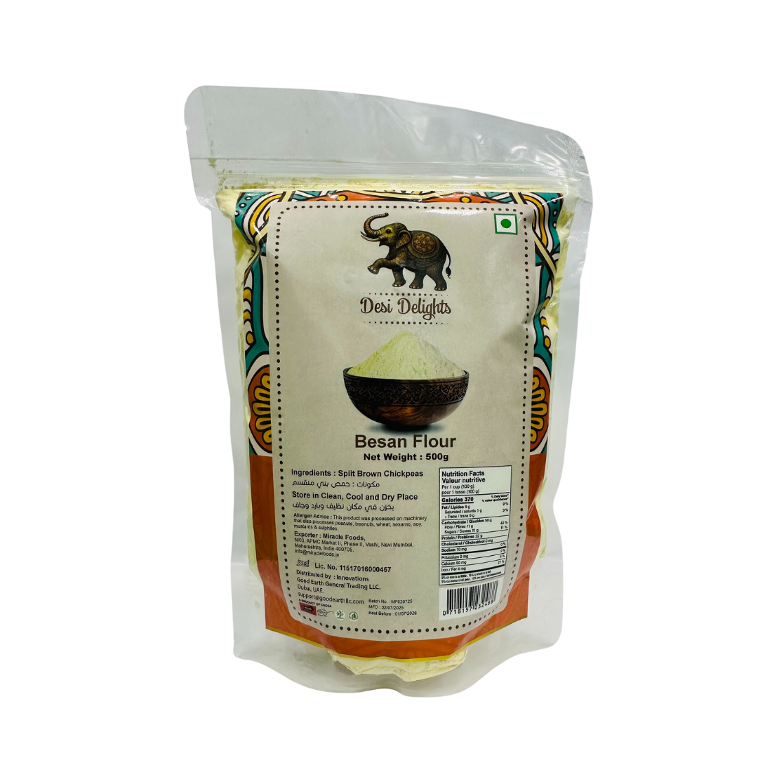Desi Delights Besan Flour 500g is made from 100% Chana Dal, finely milled to preserve nutrition and authentic taste. Rich in fibre and essential nutrients, this flour is ideal for making traditional Indian rotis, dosas, bhakris, and healthy baked dishes. Clean, pure, and unadulterated — crafted for the modern kitchen with traditional goodness. 100% Chana Dal. Authentic and naturally gluten-free Besan Flour 500g, perfect for wholesome Indian recipes and daily cooking.
