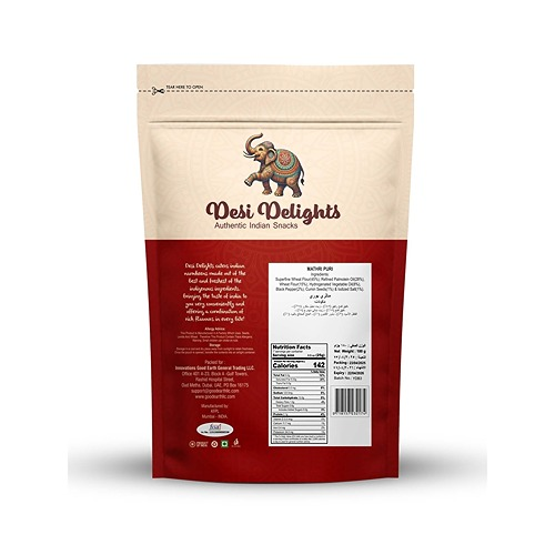 Desi Delights Mathri Puri 180g is made from Superfine Wheat Flour, Refined Palmolein Oil, Wheat Flour, Hydrogenated Vegetable Oil, Black Pepper, Cumin Seeds & Iodized Salt., finely milled to preserve nutrition and authentic taste. Rich in fibre and essential nutrients, this flour is ideal for making traditional Indian rotis, dosas, bhakris, and healthy baked dishes. Clean, pure, and unadulterated — crafted for the modern kitchen with traditional goodness.
