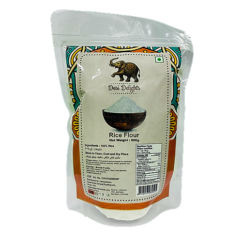 Desi Delights Rice Flour 500g is made from 100% Rice Flour, finely milled to preserve nutrition and authentic taste. Rich in fibre and essential nutrients, this flour is ideal for making traditional Indian rotis, dosas, bhakris, and healthy baked dishes. Clean, pure, and unadulterated — crafted for the modern kitchen with traditional goodness.