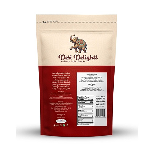 Desi Delights South Murukku 180g is made from Rice Flour, Refined Palmolein Oil, Split Black Gram Flour, Super Fine Wheat Flour, Gram Flour, Cumin Seeds, Sesame Seeds & Salt, finely milled to preserve nutrition and authentic taste. Rich in fibre and essential nutrients, this flour is ideal for making traditional Indian rotis, dosas, bhakris, and healthy baked dishes. Clean, pure, and unadulterated — crafted for the modern kitchen with traditional goodness.